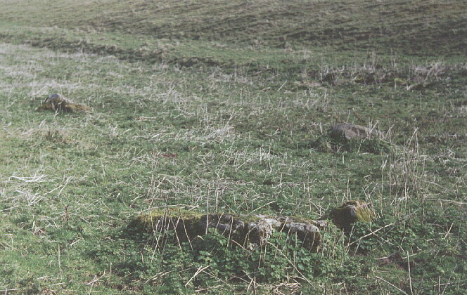 The ruins of the miniature stone circle below Tan Hill, which I rediscovered on 16th March 2002. The Tan Hill white horse was above the circle.